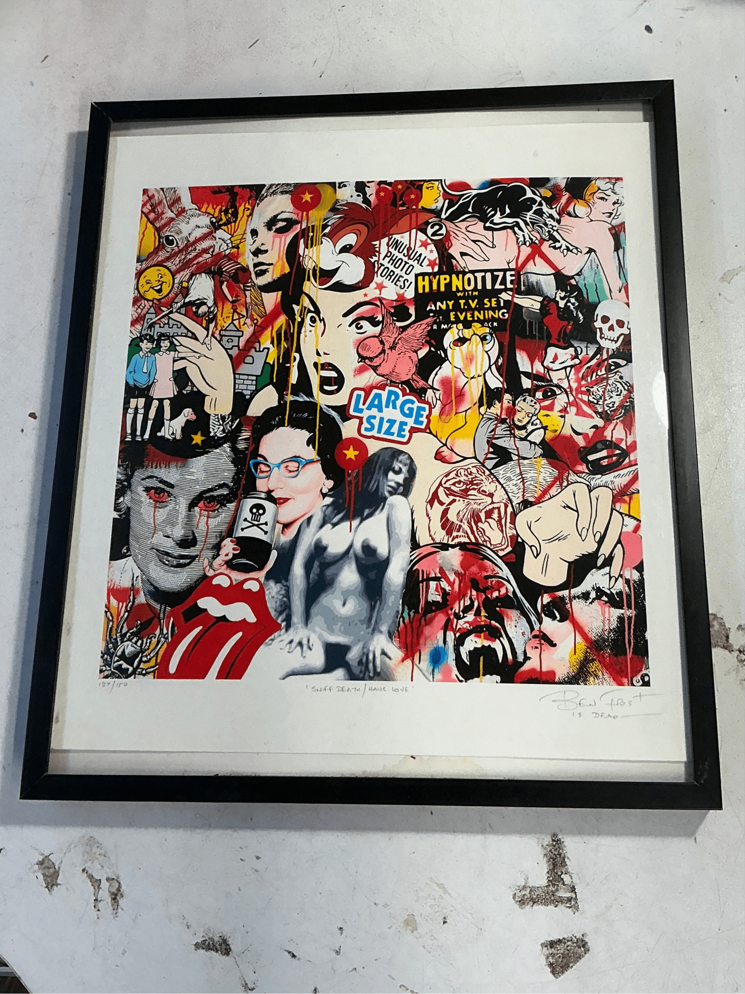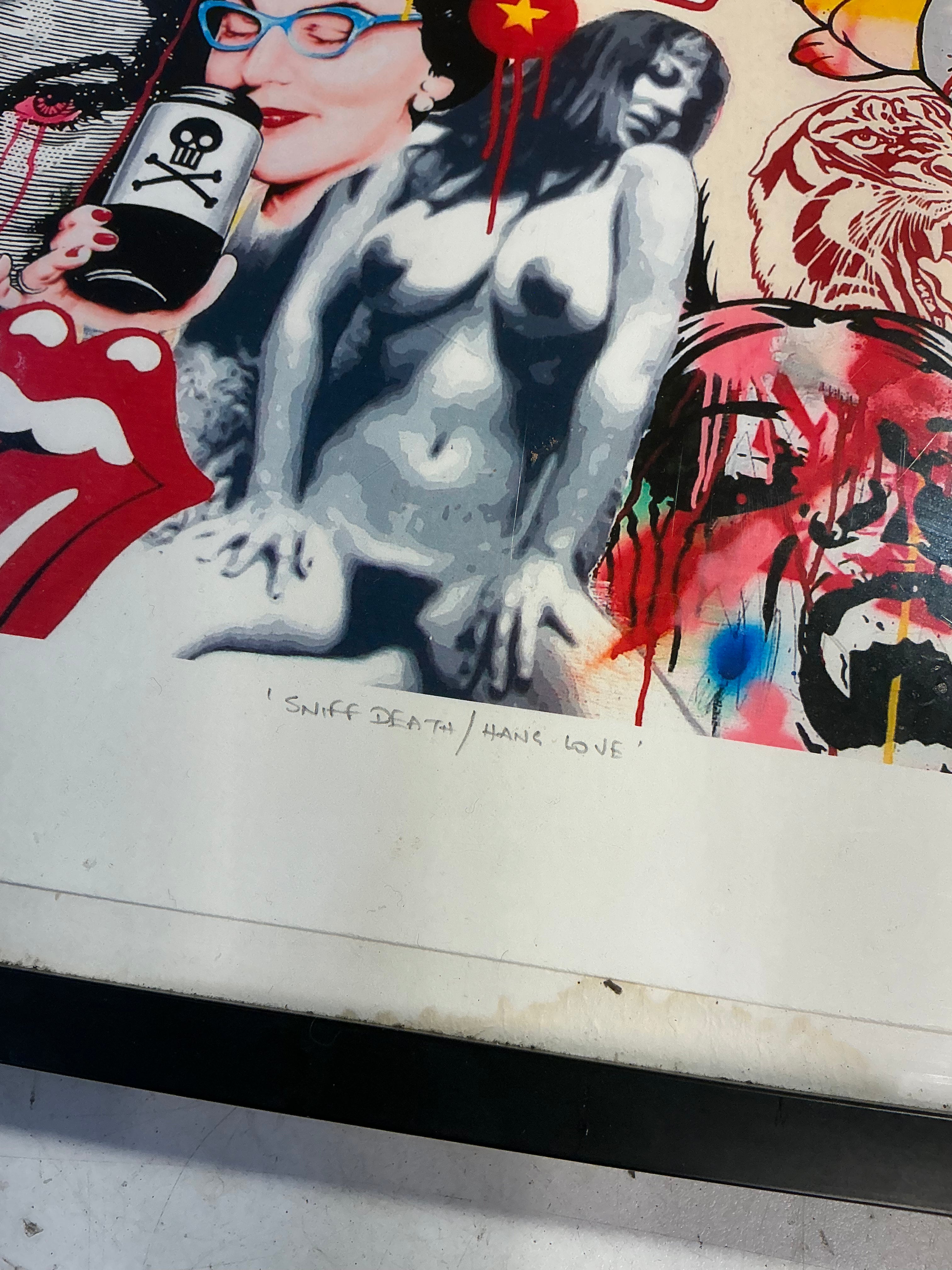 Pop art multimedia artist Ben Frost official signed print. There is minor water damage in the frame but it has not affected the print.